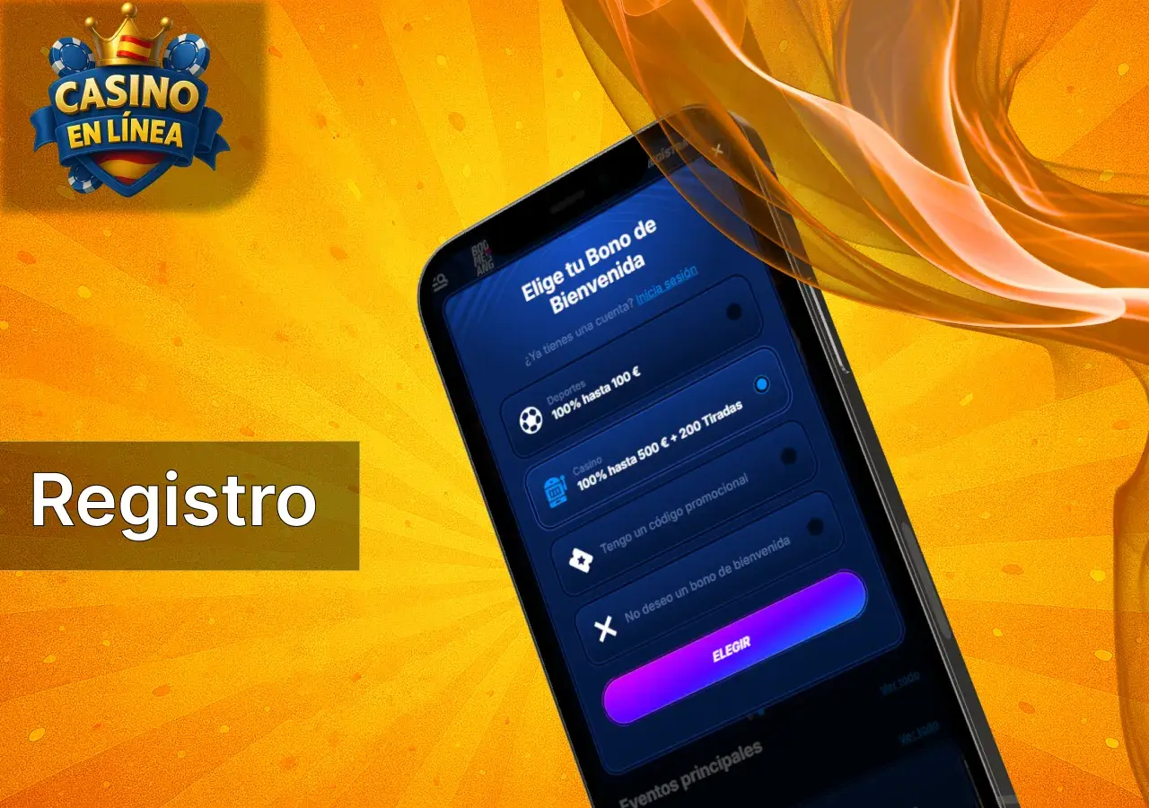 - Escoge tu bono de bienvenida. Podéis escoger entre el bono de bienvenida de casino, apuestas deportivas, usar un código promocional o no usar ningún bono.